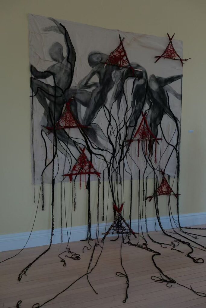 This work(figure 2) is a fusion of painting, weaving installation and spatial extensibility, giving a visual experience of the body, bondage, connection and breaking free. Multiple grey and black silhouettes of human bodies can be seen on the screen, which are intertwined with each other and seem to be dancing or struggling in a dynamic way. These bodies are not independent, but are pulled together by some invisible force, suggesting a relationship, dependence or conflict between people. The red triangular mesh structures used in the work resemble ‘boundaries’ or ‘cages’, and these forms may symbolise the social, cultural or psychological constraints that prevent individuals from truly existing independently. A large number of black woven lines extend from the main body down to the floor and even into the exhibition space, where the viewer is forced to interact with them as they look at the work.