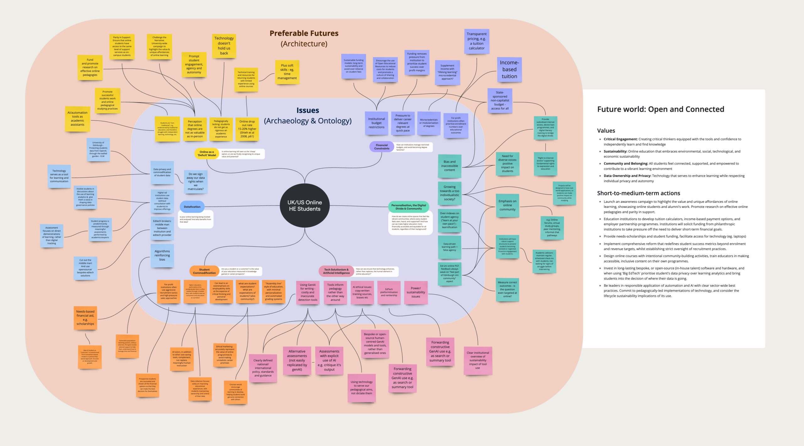 Corporate ed-tech narratives often present a future of online higher education dominated by automation, surveillance, and platformatization. However, our team’s work resists this deterministic trajectory by envisioning preferable futures grounded in human values, institutional agency, and a commitment to equity. We focused on online higher education in the UK and U.S., two regions whose systems share significant similarities, including pressures from market-driven models, datafication trends, and the challenge of maintaining quality in increasingly digital learning environments. We argue that universities must not only adapt to these challenges but actively redefine the narrative of online education, championing inclusive, community-oriented, and sustainable approaches. As Bayne and Gallagher (2021) emphasize, universities must “articulate confident, alternative imaginaries for the future of teaching… which re-introduce the values we want to teach and live by” if they are going to serve students for generations to come (p. 608).