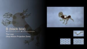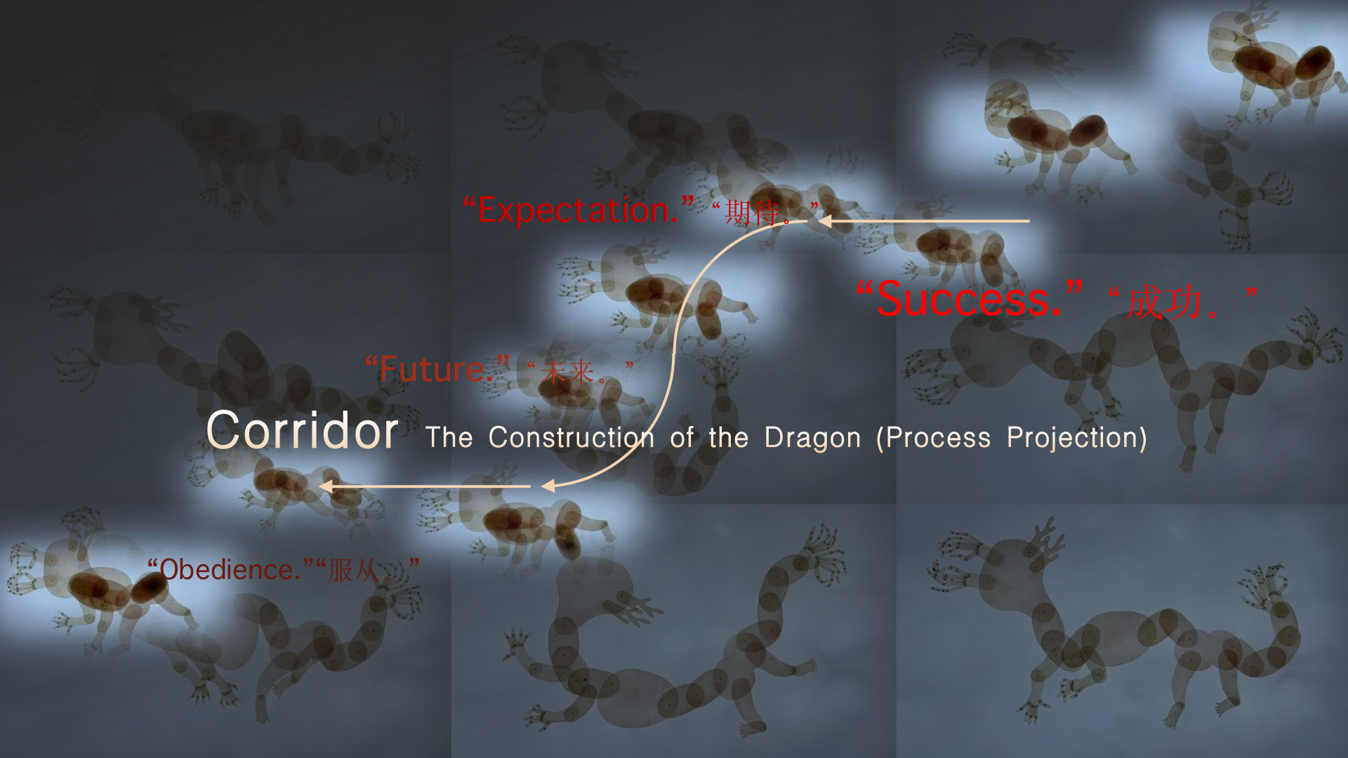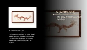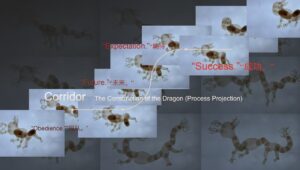 From this still dragon body project, the audience enters a narrow corridor. In this transitional space, the single-channel projection displays the stop-motion animation sequence frame by frame.