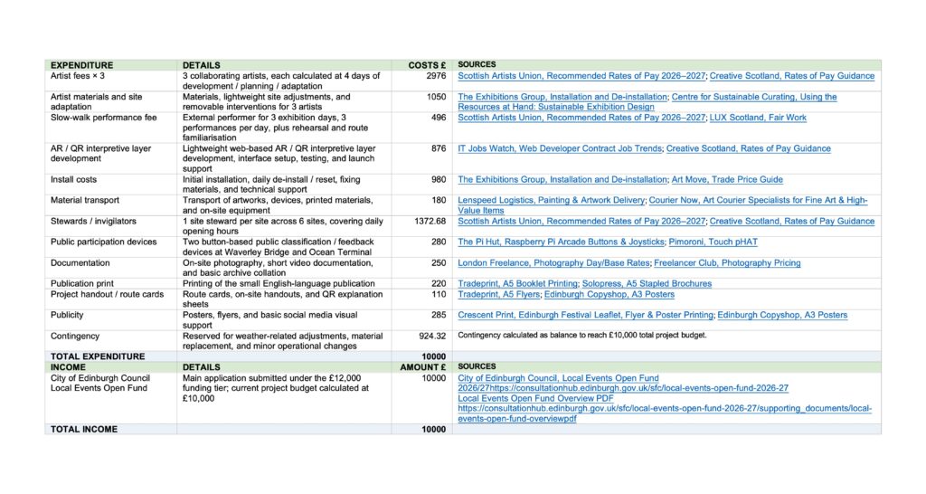 The reflection traces several key moments that reshaped the project’s method and direction. It first considers how early uncertainty developed into a more consciously curatorial mode of thinking, then shows how feedback and the curatorial pitch helped reorganise the project’s structure. It goes on to discuss how fieldwork and route testing led me to rethink viewing in public space, before using my experiences of collective work, exhibition practice, and peer review at Summerhall to show how they developed a stronger sense of collaboration, critical judgement, and a more concrete understanding of curatorial conditions. The project did not develop through the smooth refinement of a fixed idea. Rather, through a series of revisions, a conceptual interest became a more precise judgement about structure, modes of entry, and public conditions.