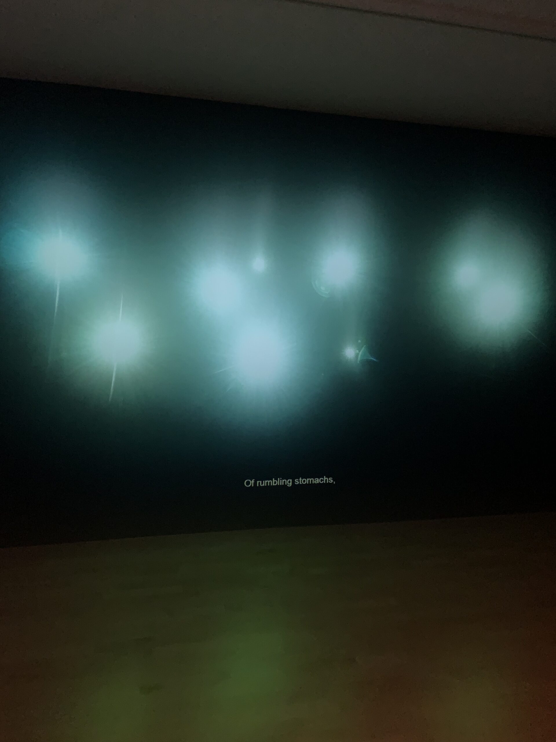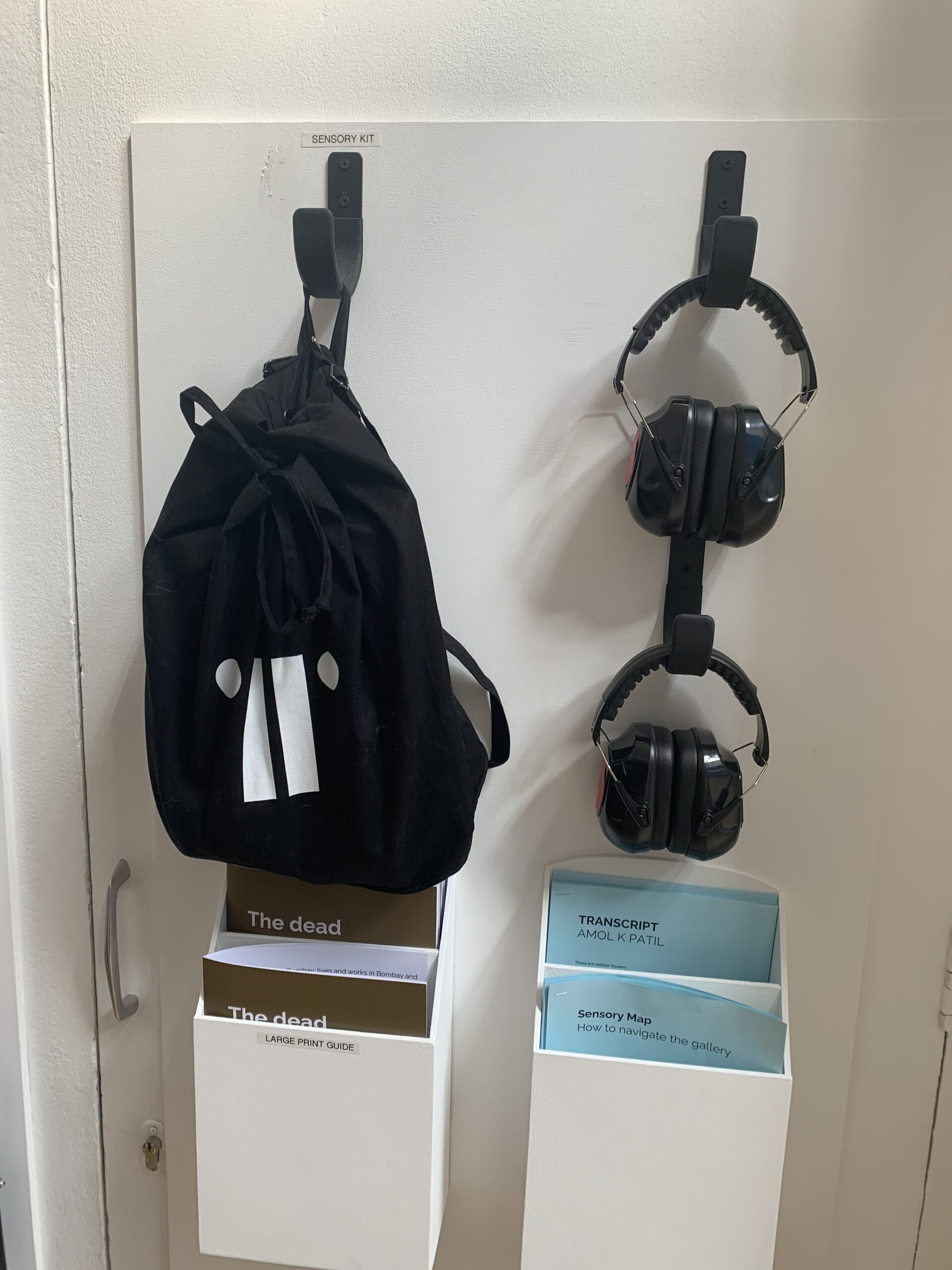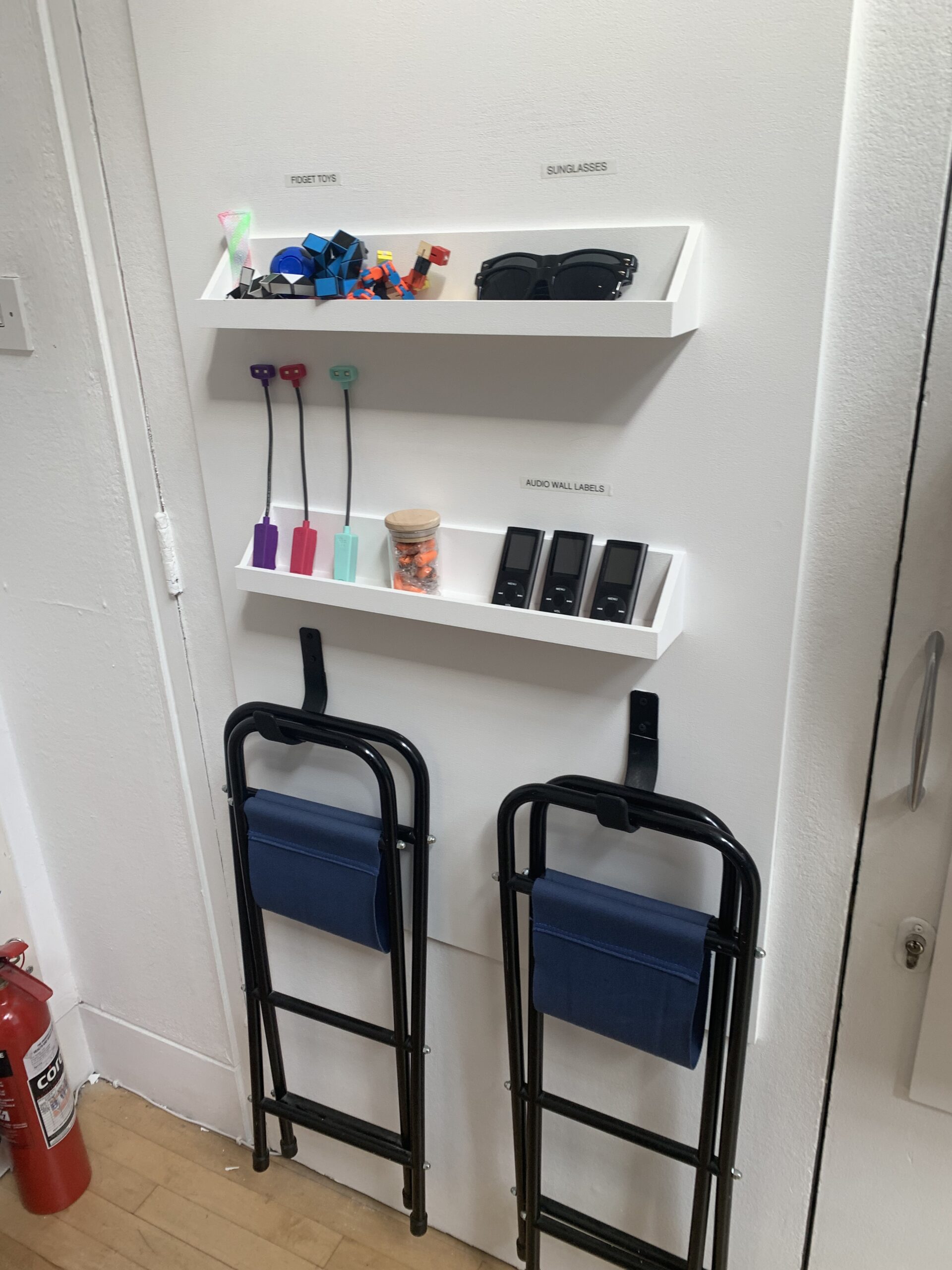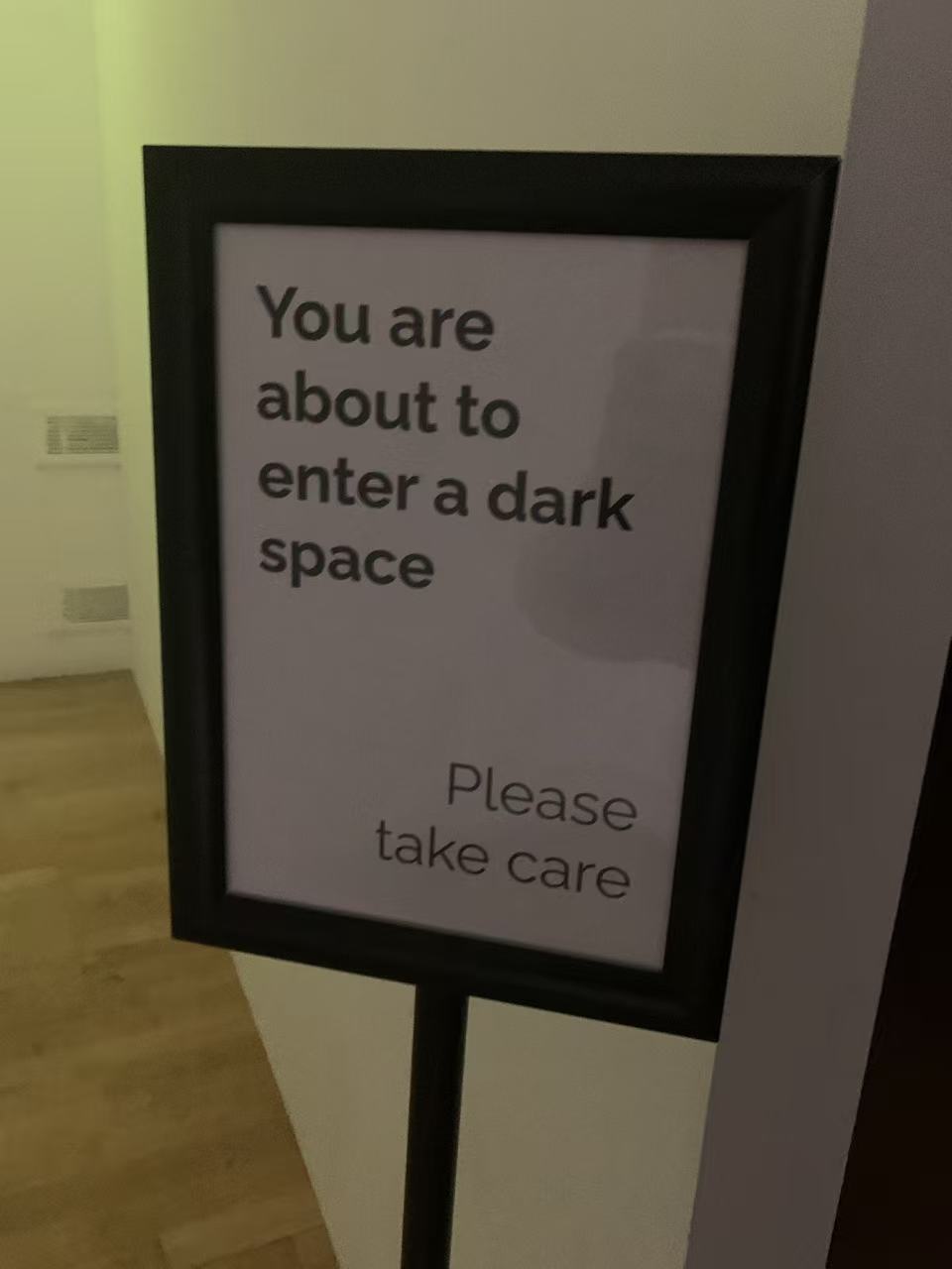This week, I visited the group exhibitionThe Dead Don’t Go Until We Do at the Talbot Rice Gallery for a case study[1]. I noticed that the accessibility facilities at the entrance were very comprehensive, including audio guides and audio labels, sunglasses, folding chairs, and even fidget toys for children and people with ADHD. I also noticed warning signs at the entrance to the dark exhibition space alerting visitors that they were about to enter a dark area, which is something I should learn from. However, I believe there should be a warning about flashing lights in front of the video installation, otherwise people with epilepsy might feel uncomfortable.