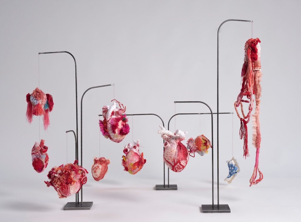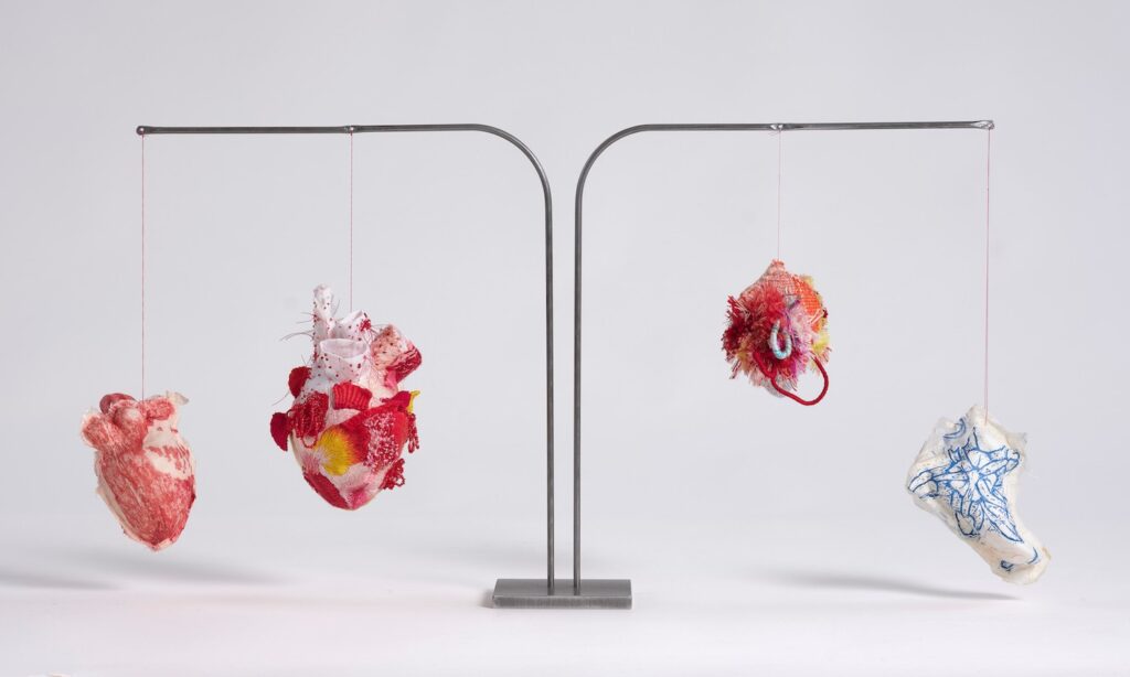 Fig 1: Hearts of Absent Women | embroidery, glass, polyester, linen, cotton, wool, hanji paper, lokta paper 70 x 78 x 60 cm (installation) | Image courtesy of the artist | 2021