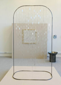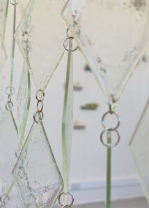 Inspired by the calming effect of rain and waterfalls on the human mind, the artist selected glass as a material symbolizing nature’s transformative processes. Repeating glass elements form a rain-curtain-like structure. As viewers move through the installation, light reflects and refracts off the glass surfaces, creating ever-shifting visual effects.