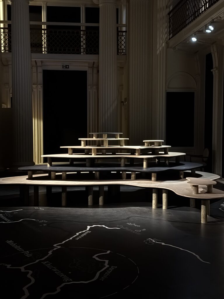 MADEYOULOOK’s installation “Mafolofolo” employs a land-art installation based on the ancient earthworks left by the Koni people to respond to the displaced African communities.The exhibition creates a multisensory experience through sound, touch, and spatial ambiance, shifting viewers’ focus from a visually centered mode of observation to embodied perception (Classen, 2017).Through a black environment, wooden topographical structures, and immersive sound, it offers viewers an immersive experience where they are transformed from spectators into participants through a multisensory engagement.