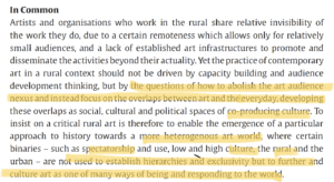 1. Central to my curatorial ethics and vision for my independent project aligns with this prospect set forth in the text; to create a “more heterogenous art world” where “binaries… further and culture art as one of many ways of being and responding to the world.” Whilst I am keenly aware of my particular situatedness in the (art)world (ie: pursuing a Postgrad in Contemporary Art Theory, having levels of education, access, and privilege), I find myself actively critical of institutions, exhibitions, and artworks that do little to speak beyond the confines of an art world, dividing what “is” art from what “isn’t”… In that art is uniquely situated to offer perspective, dialogue, and context, it carries immense power to connect audiences across their ‘differences’: to offer spaces of dialogue and cultural intersection to inspire empathy and understanding. See MyVillages, “Introduction” in MyVillages (eds.), The Rural (Whitechapel Gallery, 2019), pp. 12-19.