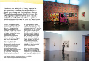 Through my research I came across the exhibition The World that Belongs to Us, co-curated by Aziz Sohail and Deborah Robinson at the New Art Gallery Walsall, which explores similar themes to my own project, though looking at identity and belonging through the lens of activism and community building. Given this, the effective title communicates a sense of agency and action, empowering publics to consider notions of belonging and to break down barriers between diverse communities and groups.