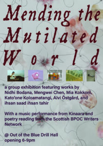 This exhibition helped me arrive at the title for my project: Mending the Mutilated World. This title seeks to communicate how the artworks in the exhibition offer opportunities to mend the divided world through intercultural dialogues and negotiations of diasporic identity; the use of “mending” seeking to demonstrate how this process is ongoing and embodied through these artists’ practices. While Zagajewski’s original poem sought to offer resilience through recognizing beauty in a fraught world, this title reflects the need to move one step forward, to enact action in our day to day lives to mend the divisive and fragmented contemporary world.