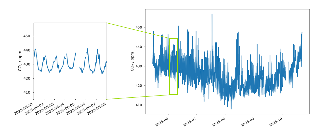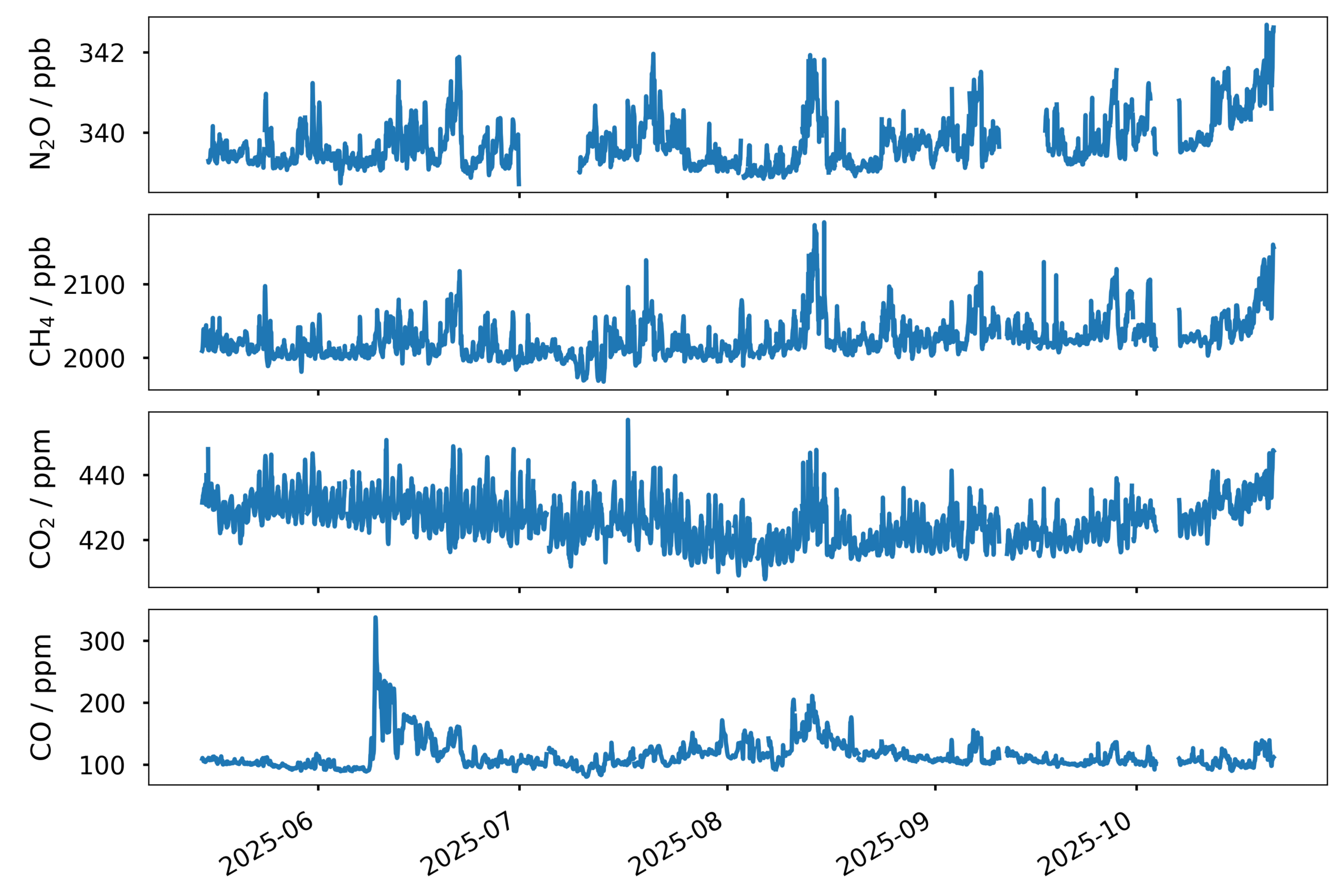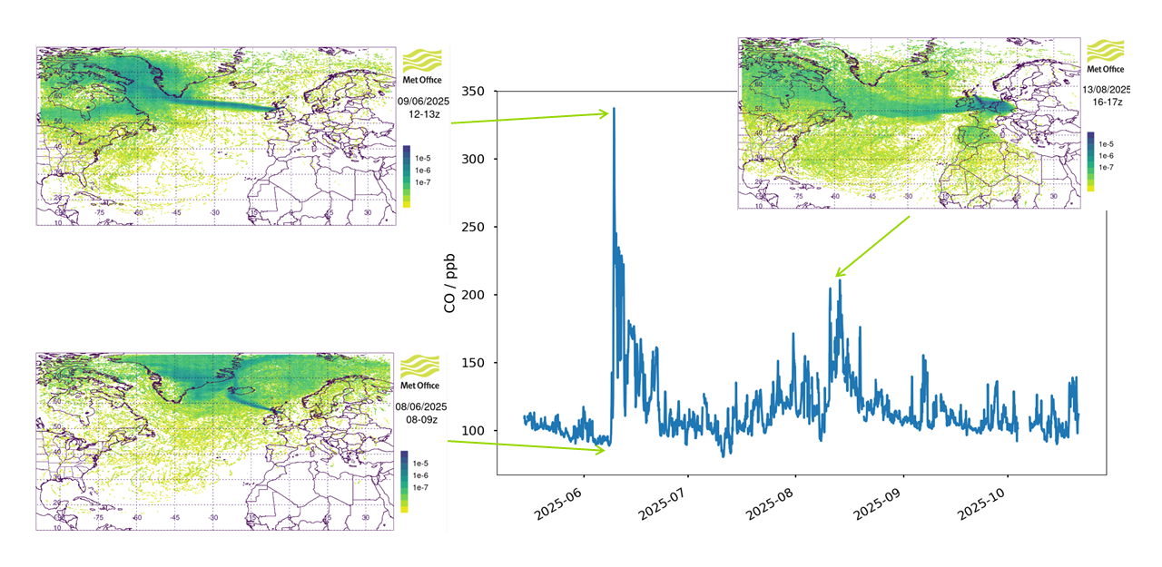 High carbon monoxide levels in June and August 2025 may have been influenced by North american wildfires.