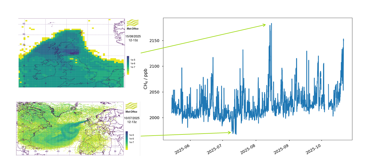 Low methane measurements in July 2025 show air coming from the North Atlantic region. High methane in August is capturing regional emissions from the northern UK.