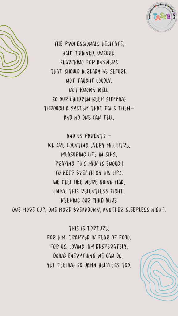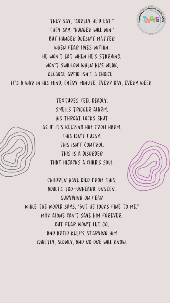 This piece offers an honest glimpse into the love, exhaustion, fear, and fierce advocacy that can shape life around feeding challenges and neurodivergence. It speaks to the realities many families face, often quietly and without enough understanding or support.