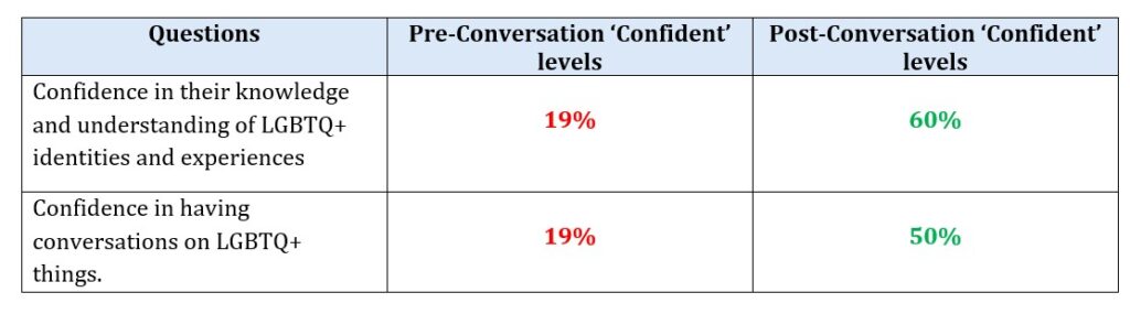 Understanding if these made a difference was a key part of the project’s design. This evidence was not only for the LGBTQ+ Community Conversations themselves, but to also demonstrate that the simple Q&A format is impactful and could be a blueprint for other Community Conversations by/with other communities.