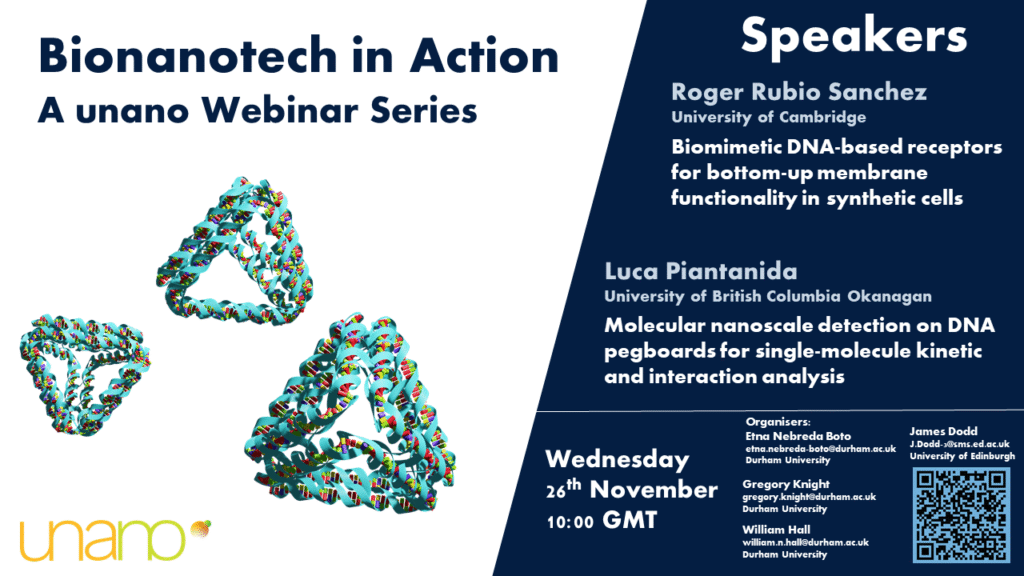 The unano webinar series is co-hosted by Dr Katherine Dunn’s research group at the University of Edinburgh and Prof Jonathan Heddle’s group at Durham University. Lucy Epton at Durham is in charge of devising the webinar schedule, and if you are interested in giving a talk for us please contact her by email at lucy.epton@durham.ac.uk. James Dodd at Edinburgh is in charge of maintaining the blog and running the webinar platform and can be reached by email at J.Dodd-3@sms.ed.ac.uk.