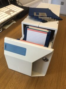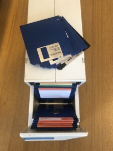 Did someone 3D print a bunch of save icons? Nope hiding in the cupboards was a storage box with the real deal! 3.5″ floppy discs with a capacity of 1.44mb. It was great fun flipping through these as some had started life as Commodore Amiga demo discs! There was even an MS-DOS operating system disc pre Windows A real blast from the past and the first time one of our Napier placement students had ever seen a floppy disc in real life. These discs met the big magnet in the sky before being re-homed for potential up-cycling, EdWeb otter Bracket coasters anyone?